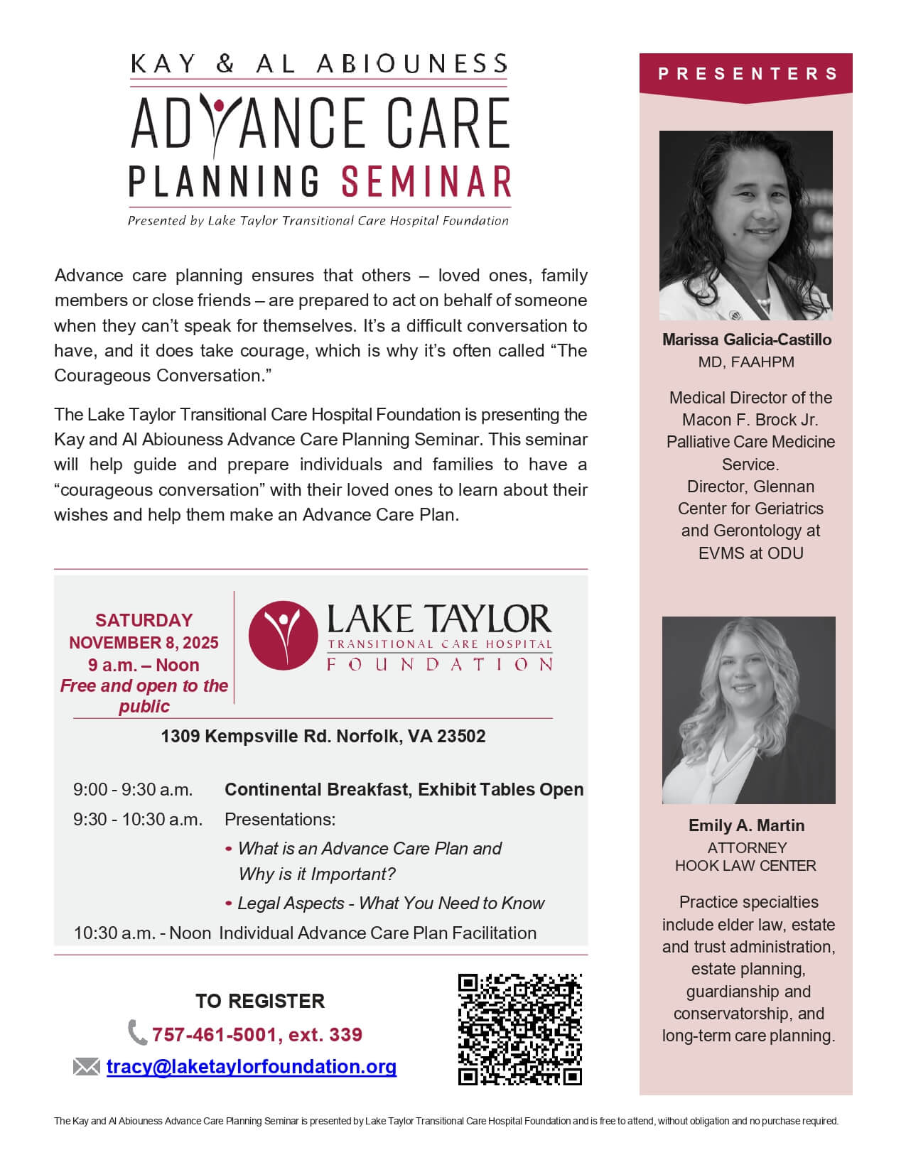 All adults, 18 and over, should have an Advance Care Plan (ACP). We are offering an ACP Seminar on Saturday, November 8, 2025 that starts at 9am with FREE breakfast and a lecture by myself and Emily Martin, JD, an Elder Law Attorney from Hook Law. Following that short lecture, we will have ACP facilitators on-site to help individuals complete their ACP – including providing witnesses, copies, and the option of uploading into the US Advance Care Plan Registry.